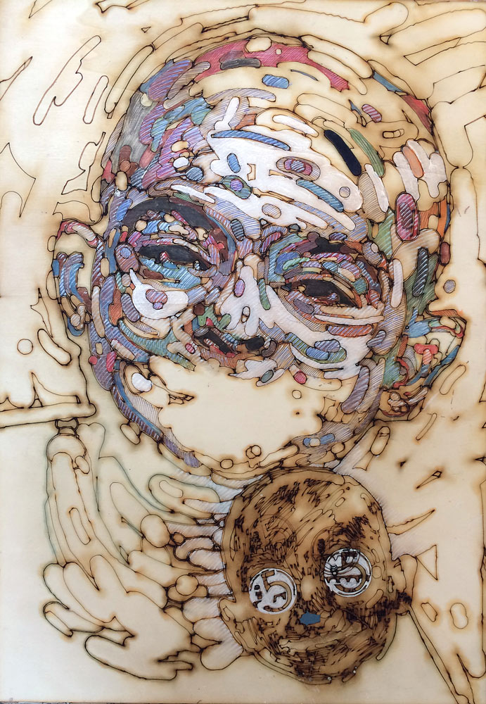 Kresba laserem, akryl na překližce